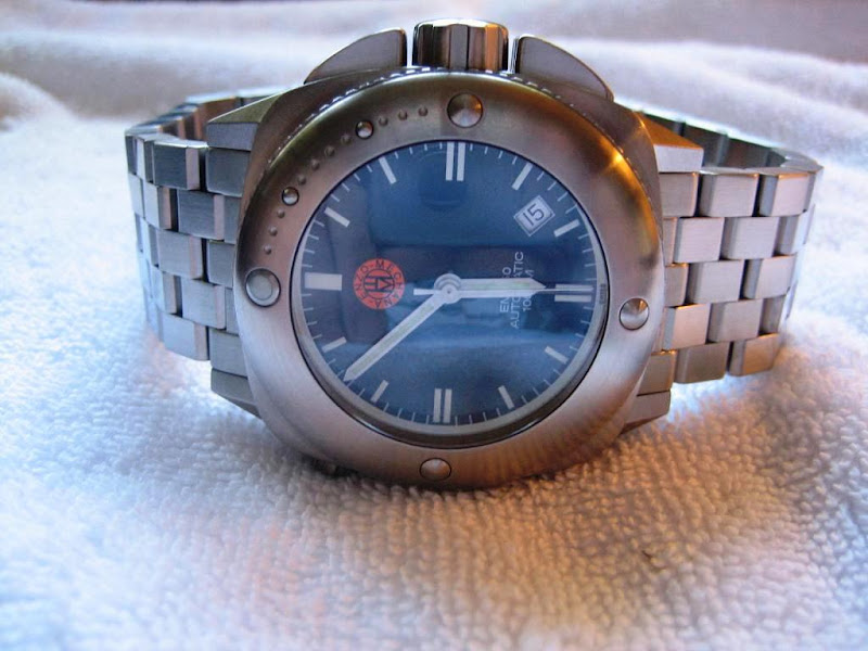 Price - $SOLD firm - CONUS with USPS Priority Mail - PayPal OK (shipping anywhere else add $50) Really hate to sell this watch but have another high end watch coming and need the funds....besides I have another Enzo Wish I could include a lume shot. The lumination around the dial looks like a "ring of fire". It is truly awsome. I got this one direct from Enzo and if you've ever bought from him, you know he checks the watch himself prior to sending it off to you. Great watch and great guy to deal with. Watch comes with his fantastic bracelet (removed links included) and all boxes and hang tags. Does not include leather or rubber straps. Here are the specs from Enzo's web site: 1) Diameter of the case: 42.00mm 2) Width of the band: 24.00mm 3) The total thickness of the watch: 16.70mm, weight 286 grams 4) Crystal: domed 5.30mm thick sapphire w ultra violet coating on the underside 5) Movement: ETA 2824-2 Automatic with engraved enzo mechana rotor 6) Case and band: 316L surgical stainless steel 7) Water resistant: 1000meter/3300ft 8) Luminous hands, minute track, and bezel triangle 9) Solid steel screwed bars affix the bracelet to the case, and screw pin bracelet with butterfly clasp with EM logo 10) Extra large setting crown 11) Deeply engraved EM logo on case back, and both crowns 12) Helium escape valve Click link below to see all the pictures: http://picasaweb.google.com/Dennis.Rudy/EnzoBlackDial ![]() Last edited on Tue Sep 18th, 2007 08:32 pm by ebiz4me |